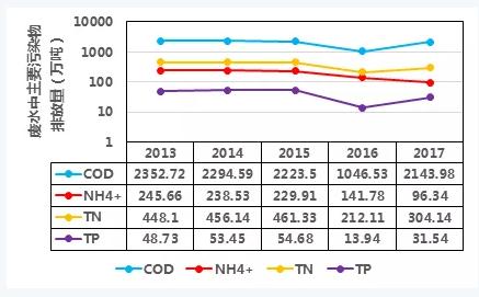 根據2013-2017年《中國統計年鑒》,我國廢水排放總量保持在700億噸,其中廢水中cod、氨氮(nh4+)、總氮(tn)、tp排放量如下圖,可見2015年國務院發布了《水污染防治行動計劃》(簡稱“水十條”)后,這幾種污染物排放量得到了削減。