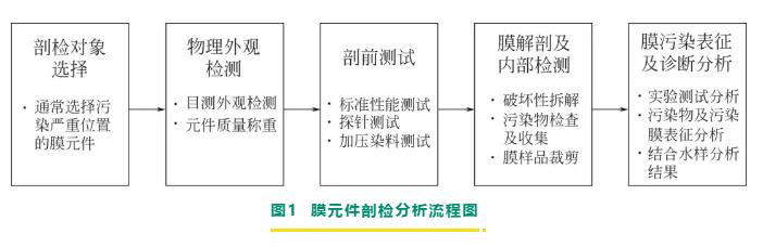 膜元件剖檢分析流程主要包括對膜元件的選擇、檢測和分析,具體是指剖檢對象選擇、物理外觀檢測、剖前測試、膜解剖及內部檢測、膜污染表征及診斷分析五個步驟。圖1是膜剖檢分析流程圖。