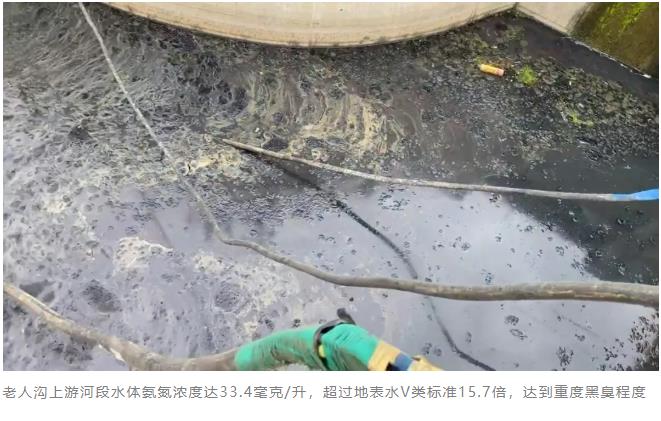 督察組前期暗訪發現,老人溝沿江平路2公里長的河段水體明顯發黑發臭,氨氮濃度最高為33.4毫克/升,超過地表水v類標準的15.7倍,達到重度黑臭程度。進一步排查發現,河道沿線排污納管仍不徹底,存在7個生活污水直排口。其中,距入槐泗河口約200米處的一處污水井大量溢流,采樣監測結果顯示,外排污水化學需氧量、氨氮濃度分別高達136毫克/升、46.0毫克/升;江陽家園西側排口排水氨氮濃度達到34.0毫克/升。老人溝上游段新建的提升泵站污水溢流入河,外排污水化學需氧量、氨氮濃度分別達到82毫克/升、19.4毫克/升。
