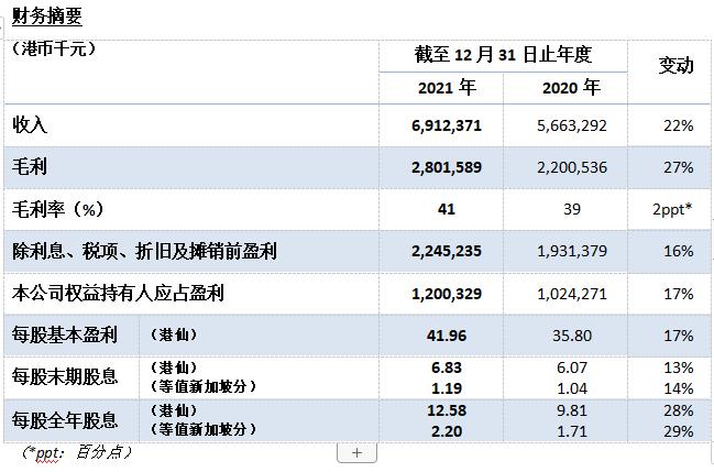 二零二一財政年度,本集團經營勢頭穩健,錄得收入69.1億港元,較二零二零財政年度增長22%;除利息、稅項、折舊及攤銷前盈利22.5億港元,較二零二零財政年度增長16%;本公司權益持有人應占盈利12.0億港元,較二零二零財政年度增長17%;每股基本盈利41.96港仙,較二零二零財政年度增加6.16港仙,增幅17%;整體毛利率為41%,較二零二零財政年度上升2個百分點。本集團融資渠道多元暢通,融資工具長短期兼備,資產質優,資金充裕,負債合理,財務狀況健康。